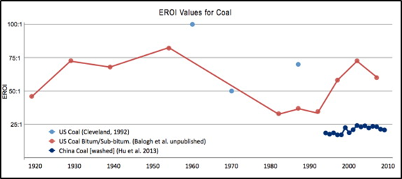 Algemeen geldend : dalende lijnen duiden op moeizamer wordende delving… ; het kost dan steeds meer energie om een bepaalde hoeveelheid energie te winnen.