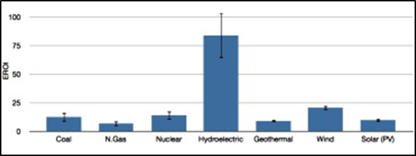 EROI nuclear » 14 ; Hydro » 84 ; Geothermal » 9 ; Wind » 18 ; Solar » 10