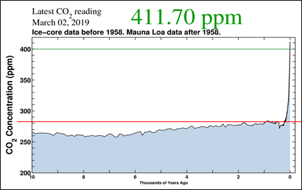 Het plaatje hieronder toont dat er sinds ca 200 jaar een aloud CO2-“evenwicht” verstoord is geraakt. De “hockeystick”-vorm is de weergave van een niet-natuurlijk verlopend proces , daarvoor is de “knik” te scherp. Het lijkt aannemelijk dat er een verband is met het grootschalig gebruik van fossiele energie sinds die tijd…..