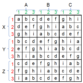 En bijv de rij Y1 of Z2 bevatten eveneens de komplete rijen van de resp. blokken.