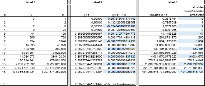 Wat ik wèl zag was dat naarmate n groter werd de verhouding yn / zn steeds dichter naderde tot een konstante waarde , afwisselend er onder of erboven (zie tabel 2). Deze waarde bleek overeen te komen met 1/e , waarin e een bekende wiskundige konstante is (e = 2,71828…..)