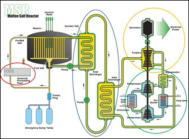 - * in de rode kring de chemische fabriek waar het gesmolten zout op gewenste koncentraties wordt gehouden ; dwz ontdaan wordt van restprodukten en voorzien van verse nucleaire “brandstof”.