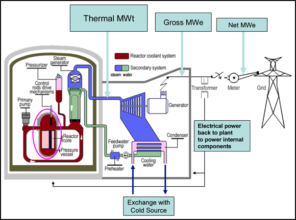 - – Gross electrical MWe, which indicates the power produced by the attached steam turbine and generator, and also takes into account the ambient temperature for the condenser circuit (cooler means more electric power, warmer means less). Rated gross power assumes certain conditions with both.