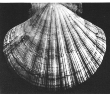 Ref.2 : Schelpen (zoals deze Pecten Grandis uit het Plioceen bij Kallo in de buurt van Antwerpen) vertonen groeilijntjes waaruit het aantal dagen in het jaar in het verleden valt af te leiden.