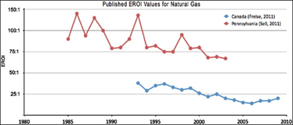 - Dit laatste is te zien in EROI-plaatjes. De EROI is een getal dat uitdrukt hoeveel eenheden energie je terugkrijgt als je 1 eenheid besteedt aan het winnen ervan. In een grafiek vormen deze getallen in de loop der tijd een lijn